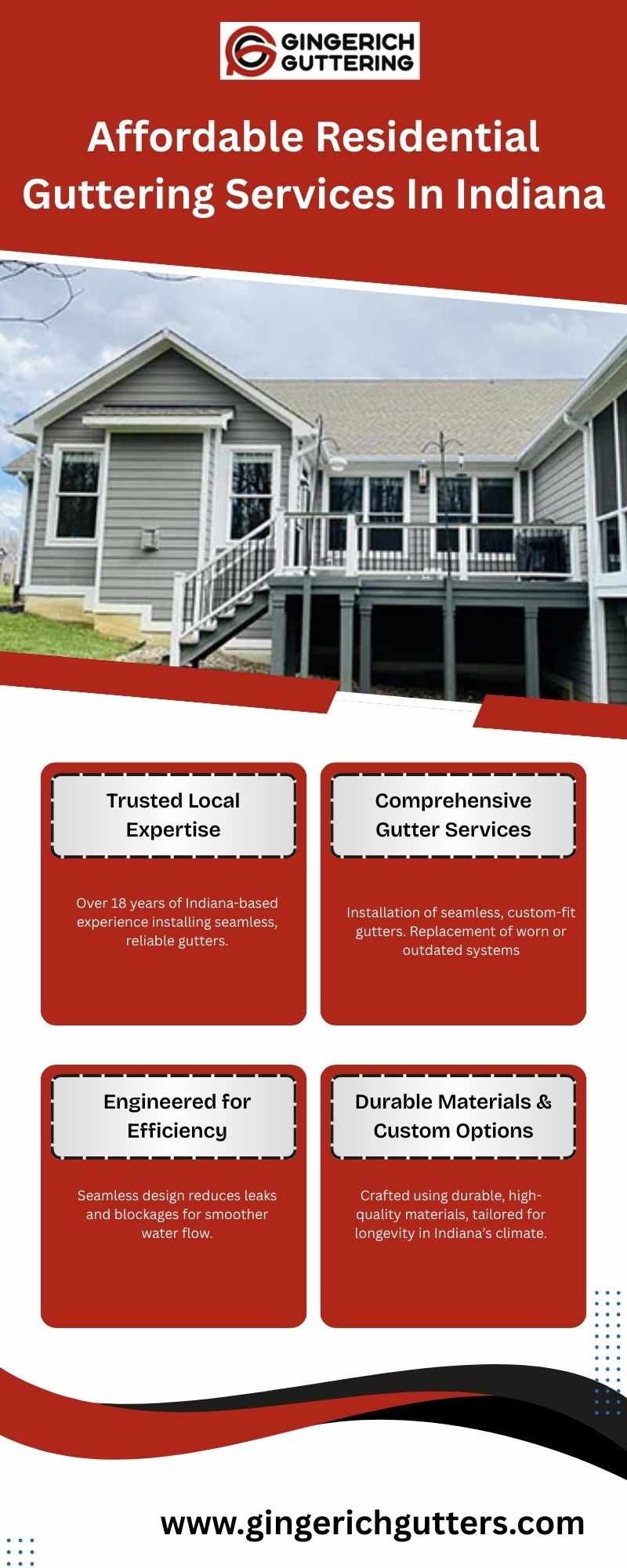 Gingerich Guttering delivers affordable and reliable residential guttering services Indiana homeowners trust. With over 18 years of local experience, we specialize in seamless gutter installation, replacement, maintenance, and optional leaf guard systems to enhance durability and curb appeal while protecting your home from water damage.